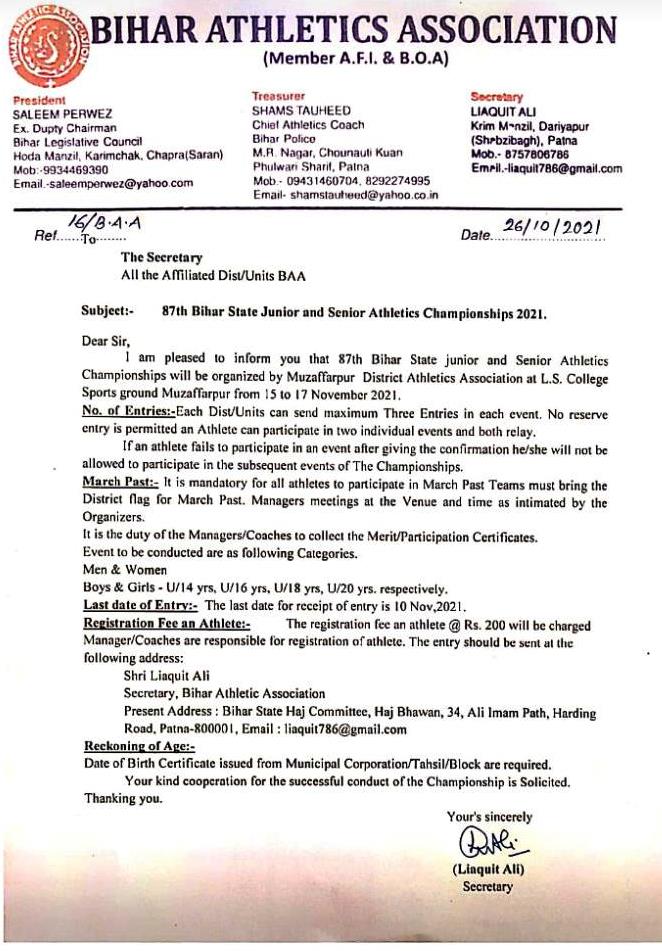 पटना। बिहार एथलेटिक्स एसोसिएशन के बैनर तले मुजफ्फरपुर जिला एथलेटिक्स एसोसिएशन के द्वारा आगामी 15 और 17 नवंबर को एलएस कॉलेज ग्राउंड पर 87वीं बिहार राज्य जूनियर और सीनियर एथलेटिक्स चैंपियनशिप का आयोजन किया जायेगा। इस संबंध में बिहार एथलेटिक्स एसोसिएशन के सचिव लियाकत अली के हस्ताक्षर से पत्र निर्गत कर दिया गया है। हर जिला से एक इवेंट में तीन प्रतिभागियों की इंट्री मांगी गई है। इस प्रतियोगिता में बालक व बालिका वर्ग के एज ग्रुप अंडर-14, 16, 18, 20 के अलावा महिला व पुरुष की स्पर्धाएं आयोजित की जायेंगी।