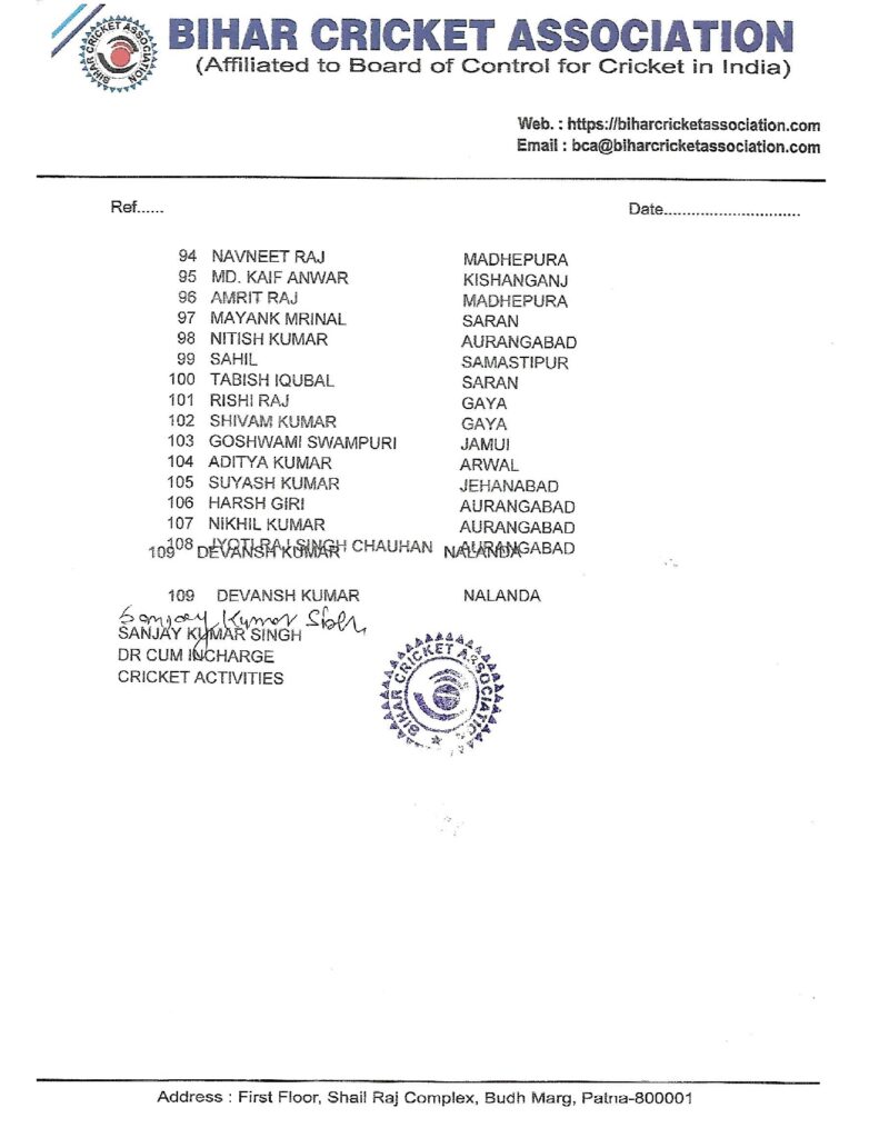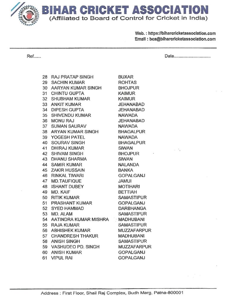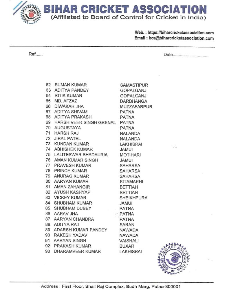 विजय मर्चेन्ट अंडर-16 की सूची जारी की जा रही है। इन खिलाड़ियों को बिहार कैम्ब्रिज क्रिकेट एकेडेमी (एम्स के समीप) नहरपुरा में कैंप चालू है। खिलाड़ियों को प्रकाश कुमार सिंह को रिपोर्ट करना है।