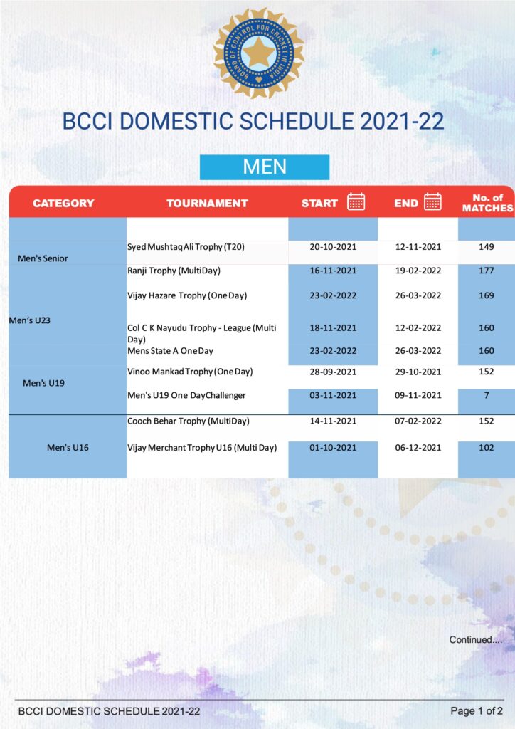 बीसीसीआई सचिव जय शाह के हस्ताक्षर से जारी इस प्रेस रिलीज के अनुसार 20 अक्टूबर से सैयद मुश्ताक अली ट्रॉफी टी-20 क्रिकेट टूर्नामेंट की शुरुआत होगी जिसका फाइनल 12 नवंबर को खेला जायेगा।