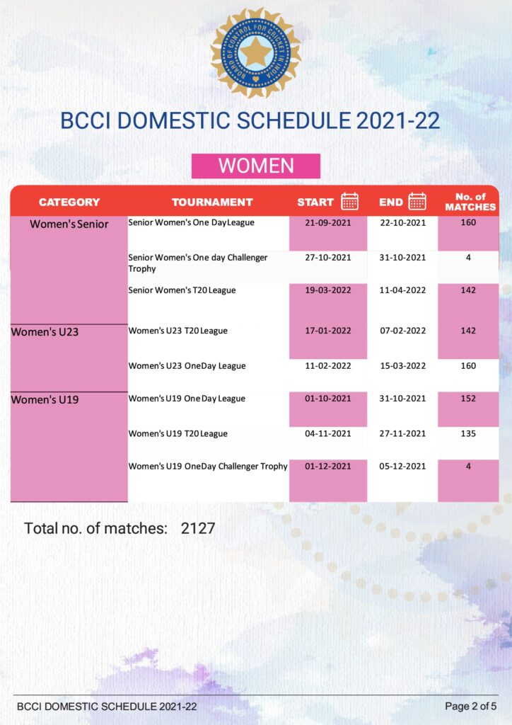 विभिन्न आयु वर्गों को मिला कर कुल 2127 घरेलू मैच खेले जायेंगे। बीसीसीआई ने कहा कि मैचों के दौरान कोविड-19 से बचाव के सारे उपाय किये जायेंगे।