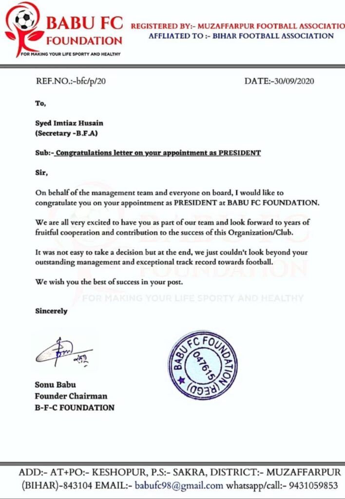 पटना। बिहार फुटबॉल संघ के सचिव सैयद इम्तियाज हुसैन को बाबू फाउंडेशन का अध्यक्ष नियुक्त किया गया है। इस संबंध का पत्र बाबू फाउंडेशन के फाउंडर चेयरमैन सोनू बाबू ने जारी किया है। पत्र में कहा गया है कि आपकी मेहनत की बदौलत बिहार में फुटबॉल काफी विकास हुआ है। हमारे संगठन को भी आपके अनुभवों का पूरा फायदा मिलेगा।