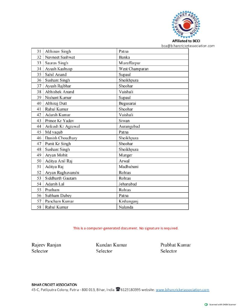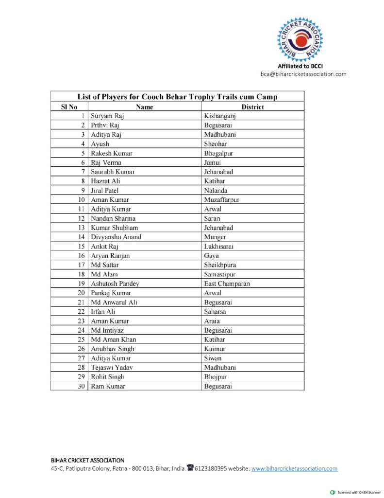 सत्र 2023-24 की अंडर-19 वीनू मांकड़ ट्रॉफी टीम के सदस्य स्टैंड बाई सहित और विगत सत्र 2022-23 के कूच बिहार टीम के योग्य सदस्य, जिनका नाम इस सूची में नहीं है वो भी इस ट्रायल सह अभ्यास शिविर में भाग लेंगे। किसी भी प्रकार की रिपोर्टिंग संबंधित जानकारी के लिए बिपिन कुमार (मोबाइल नंबर:- 9021902881) पर संपर्क किया जा सकता है।