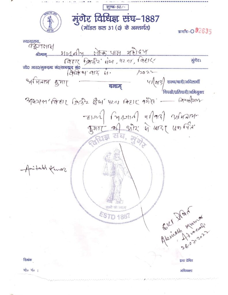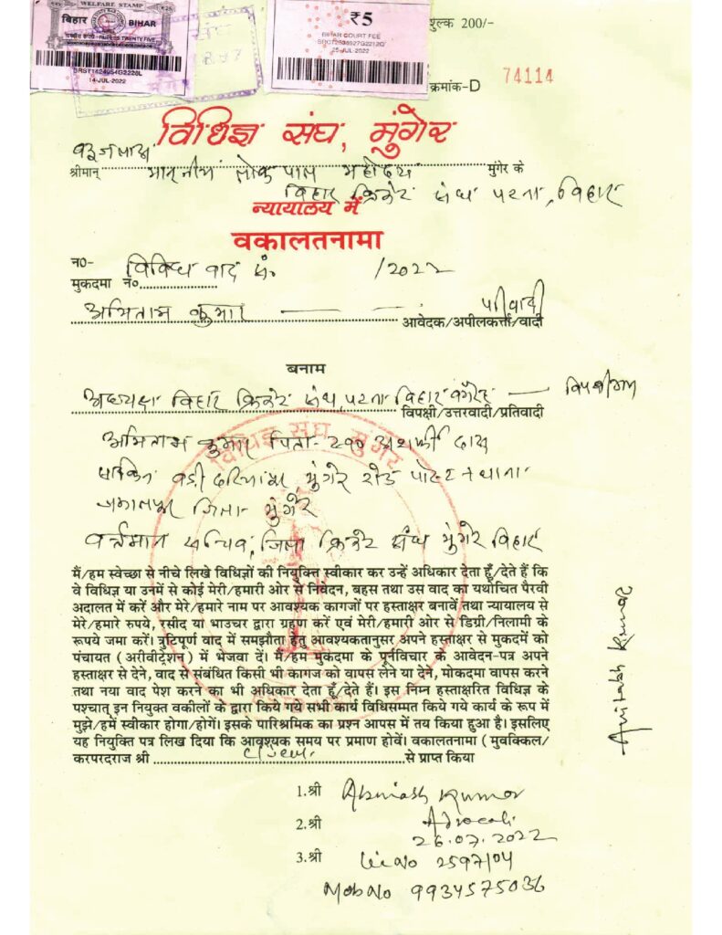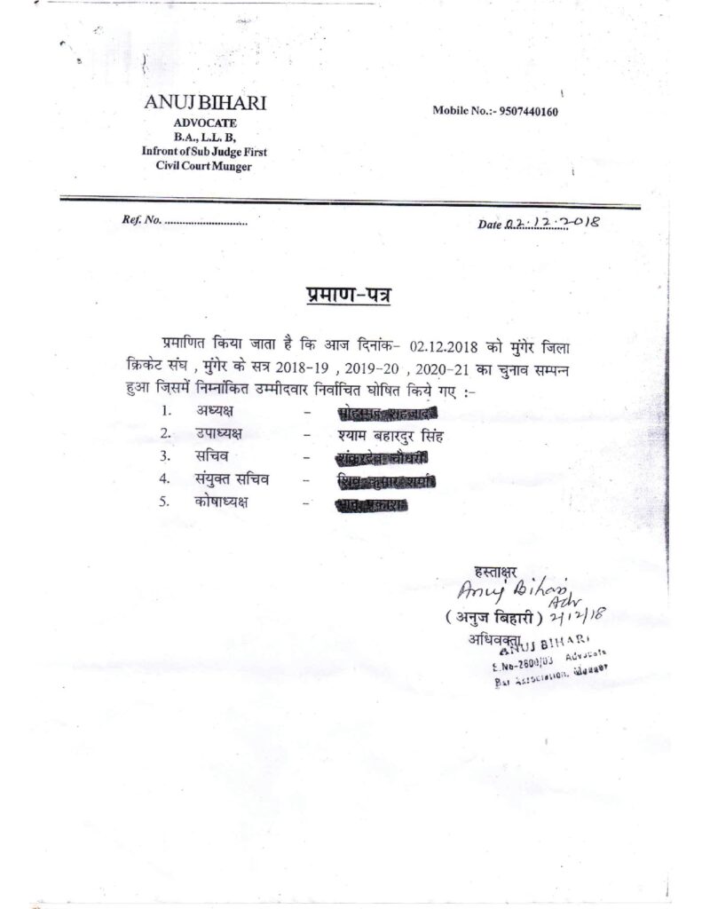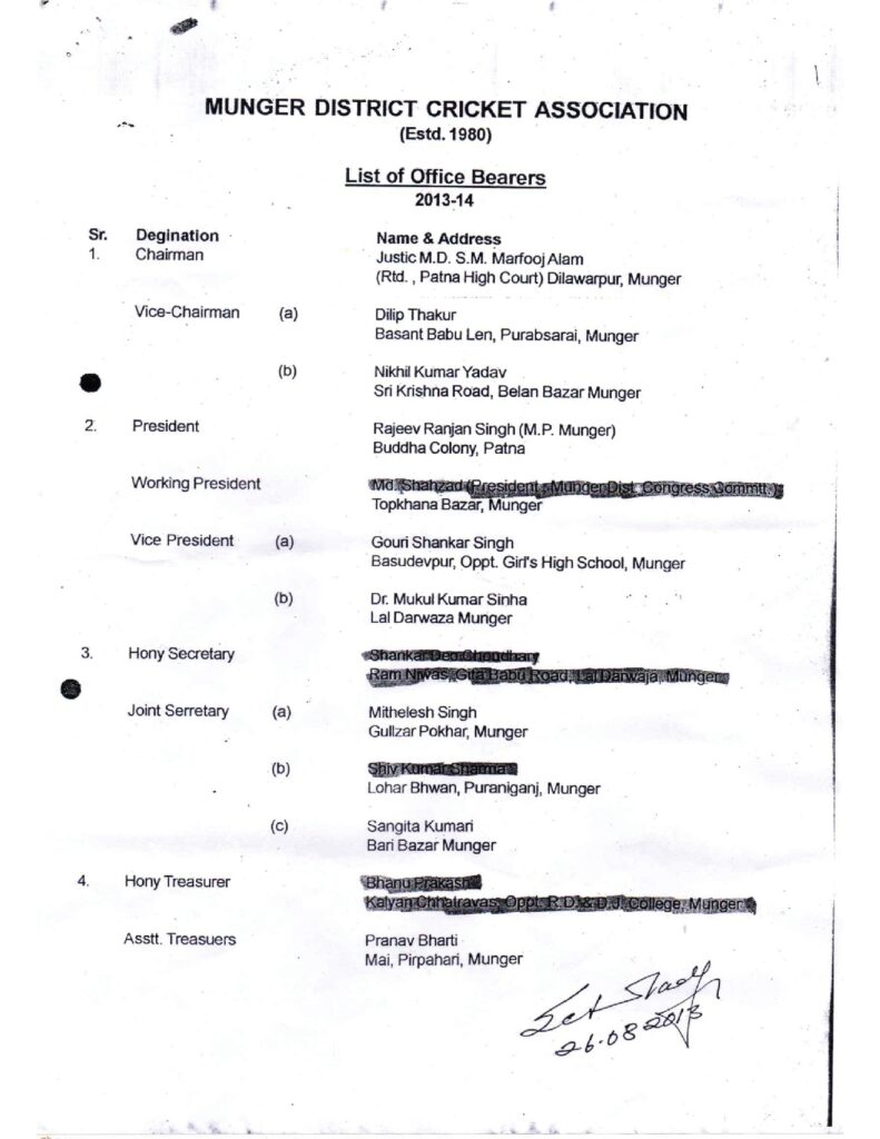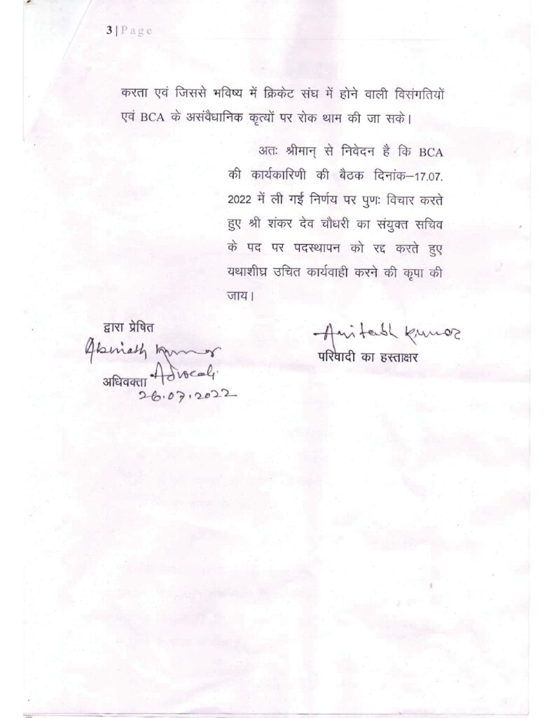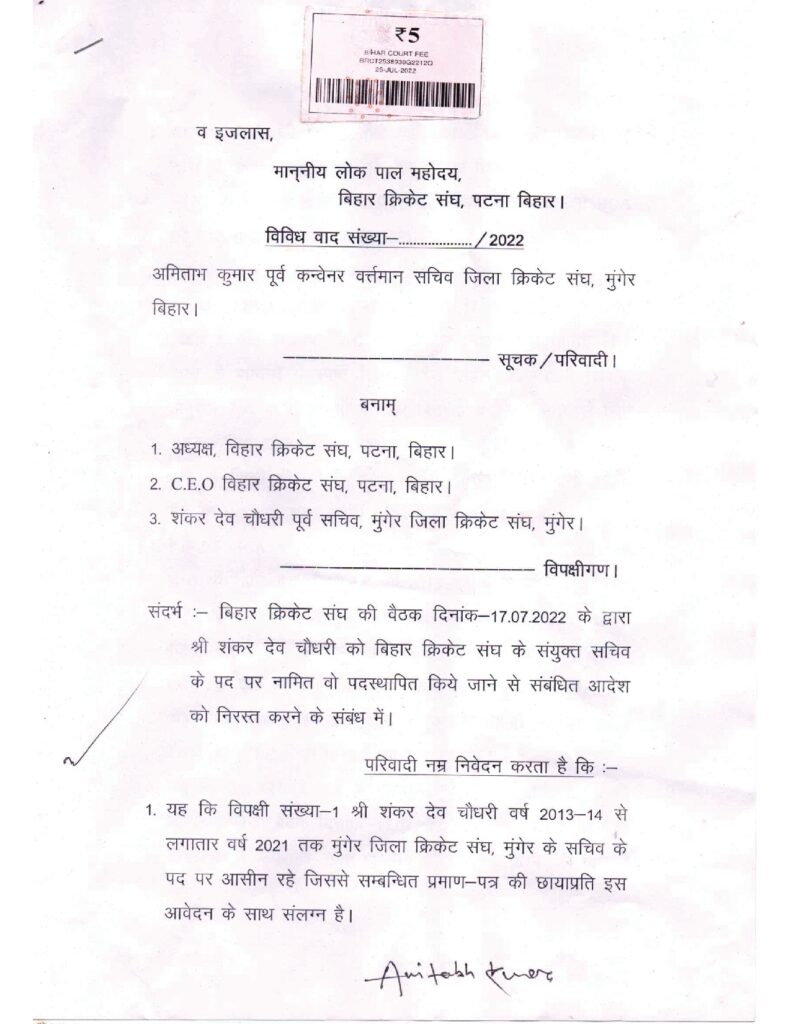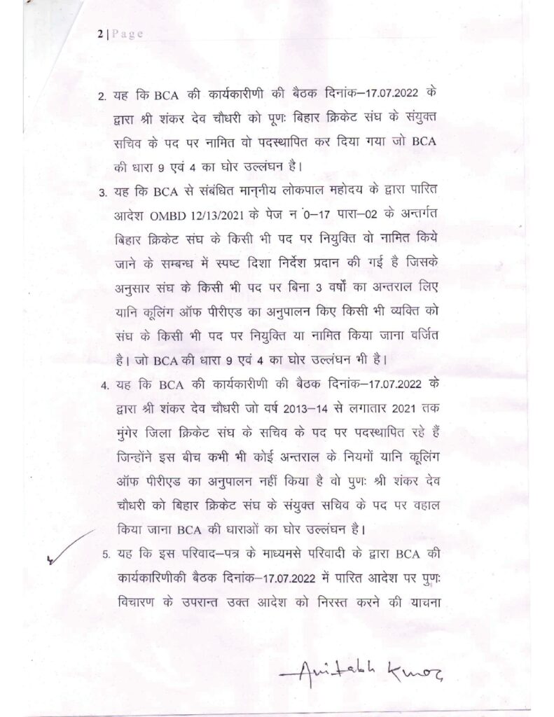 अमिताभ कुमार ने लोढ़ा कमेटी के नियमों और बिहार क्रिकेट एसोसिएशन के संविधान का हवाला देते हुए कहा कि शंकर देव चौधरी वर्ष 2013-14 से वर्ष 2021 तक मुंगेर जिला के सचिव के पद पर आसीन रहे हैं। ऐसे में उनका मनोयन गलत है। उन्हें नियम से कूलिंग पीरियड में जाना चाहिए था।