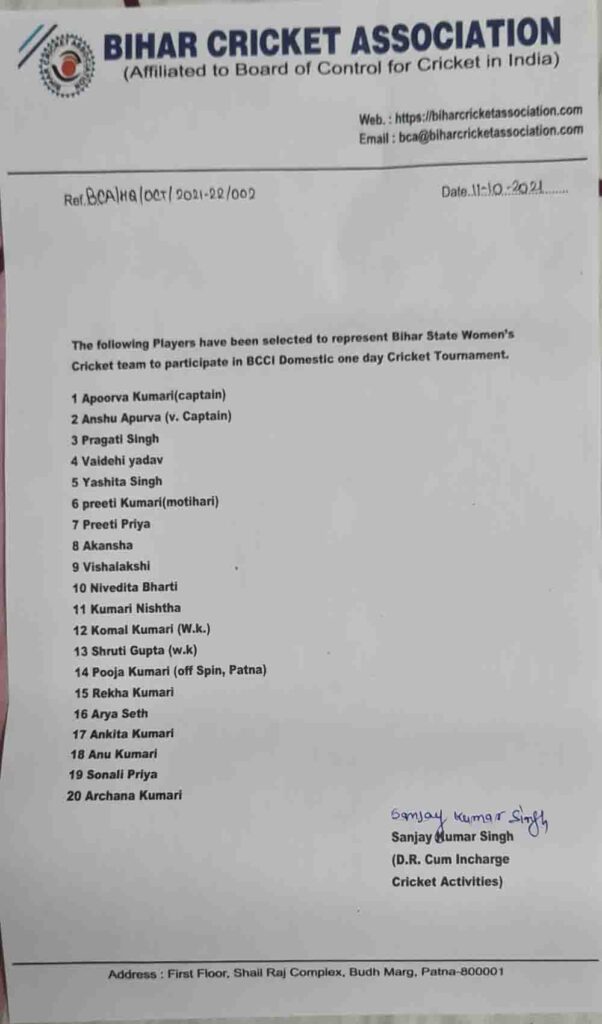 पटना। बिहार क्रिकेट एसोसिएशन ने सीनियर वीमेंस टीम की घोषणा कर दी है। अपूर्वा कुमारी को टीम की कमान सौंपी गई है। अंशु अपूर्वा टीम की उपकप्तान होंगी। इस संबंध में बिहार क्रिकेट एसोसिएशन की बेवसाइट पर डीआर कम इंचार्ज क्रिकेट एक्टविटीज संजय कुमार सिंह के हस्ताक्षर से नोटिफिकेशन कर दिया गया है।