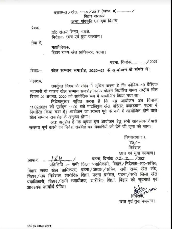 पटना। कोरोना काल के कारण बिहार सरकार के कला, संस्कृति एवं युवा विभाग के तत्वावधान में बिहार राज्य खेल प्राधिकरण द्वारा आयोजित होने वाला खेल सम्मान समारोह वर्ष 2020 में नहीं आयोजित किया जा सका था। अब यह आयोजन 11फरवरी को पाटलिपुत्र स्पोट्र्स कॉम्प्लेक्स के इंडोर हॉल में 11 फरवरी को आयोजित किया जायेगा। इस संबंध में खेल विभाग के डायरेक्टर के द्वारा पत्र निर्गत कर दिया गया है।