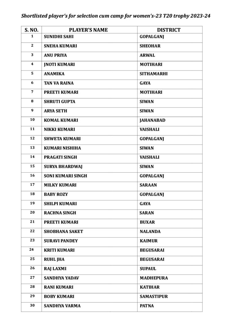 पटना, 30 नवंबर। भारतीय क्रिकेट कंट्रोल बोर्ड (बीसीसीआई) द्वारा आयोजित होने वाली अंडर-23 वीमेंस टी20 टूर्नामेंट में भाग लेने वाली बिहार टीम के चयन के लिए कैंप 1 दिसंबर से पटना के संपतचक स्थित लॉ मार्टिनियर वर्ल्ड स्कूल कैंपस में चलने वाली बिहार क्रिकेट एकेडमी में लगाया गया है। कैंप सुबह दस बजे से शुरू होगा।