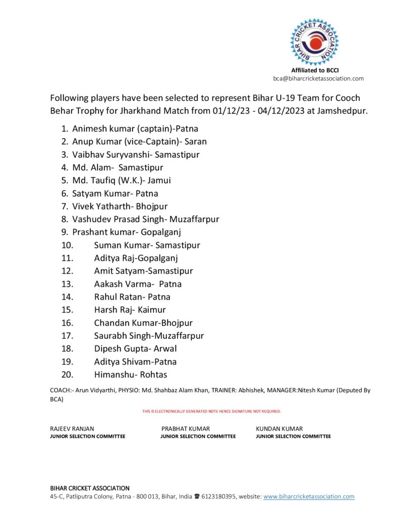 पटना, 30 नवंबर। भारतीय क्रिकेट कंट्रोल बोर्ड (बीसीसीआई) के तत्वावधान में आयोजित कूच बिहार ट्रॉफी अंडर-19 डेज टूर्नामेंट के अंतर्गत बिहार अपना तीसरा मैच झारखंड के खिलाफ शुक्रवार से खेलने उतरेगा। तीसरे मैच के लिए बिहार क्रिकेट एसोसिएशन ने प्लेयरों की लिस्ट जारी है। लिस्ट 20 सदस्यीय है। टीम में कुछ बदलाव हुए हैं।
