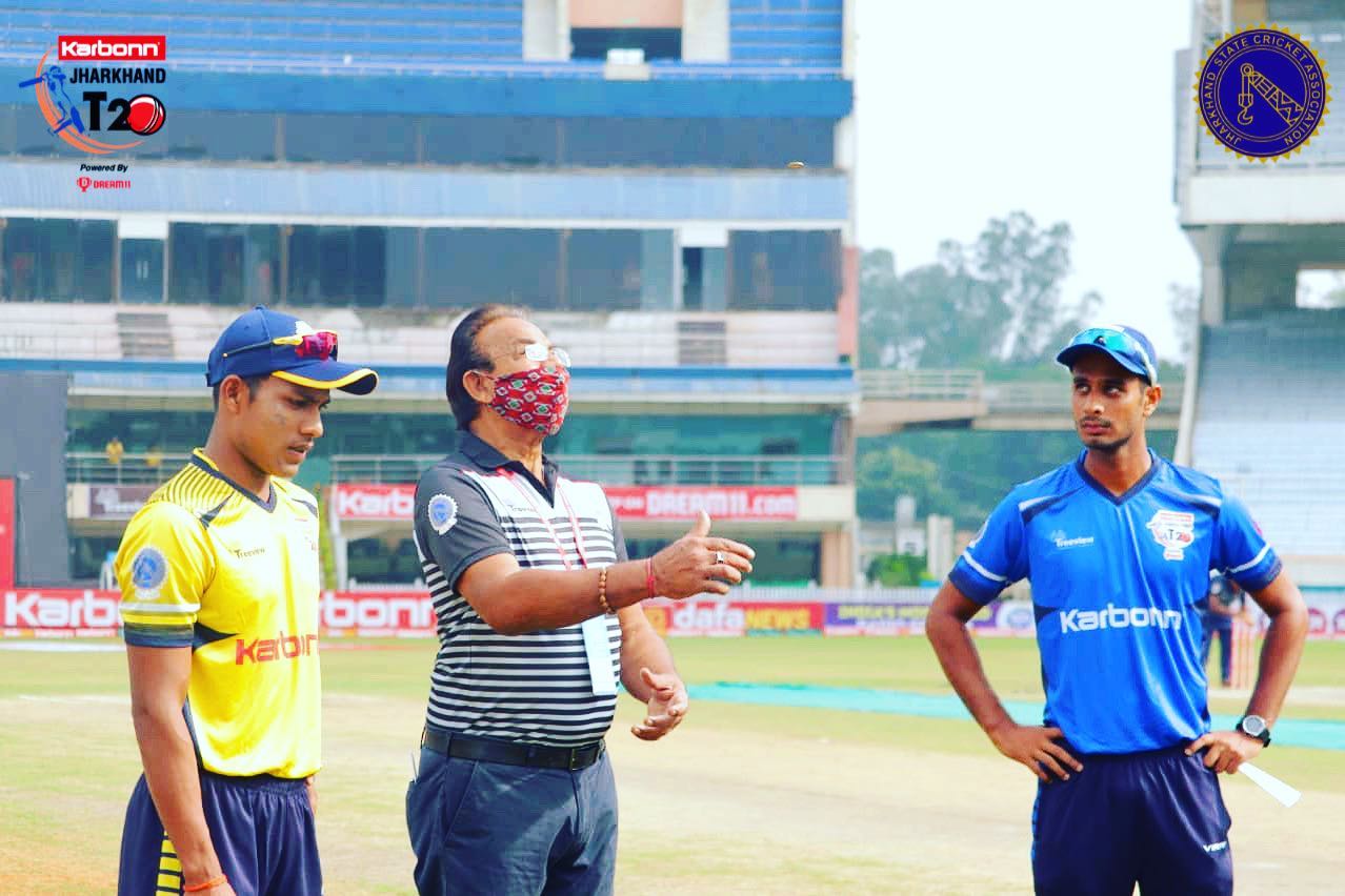 पहले बैटिंग करने उतरी रांची की टीम की शुरुआत खराब रही। उसके दो विकेट मात्र 8 रन पर गिर गए। सलामी बल्लेबाज सत्येंद्र कुमार प्रजापति बिना खाता खोले और शिखर मोहन 2 रन बना कर आउट हो गए। इसके बाद आदित्या सिंह ने आर्यमन सेन के साथ लड़खड़ाती पारी को संभाला। दोनों के बीच 36 रनों की साझेदारी हुई। तीसरा विकेट आदित्य सिंह के रूप में गिरा। वे 21 गेंदों में 18 रन बना कर आउट हुए। इसके बाद जिम्मेवारी पंकज कुमार पर आ गई और उन्होंने आर्यमन सेन के साथ मिलकर शानदार बैटिंग की और 79 रनों की शानदार पाटर्नरशिप की। आर्यमन सेन के आउट होने के बाद एक छोर को पंकज कुमार ने संभाले रखा और विवेकानंद तिवारी नाबाद 12 रनों के सहयोग से निर्धारित 20 ओवर में स्कोर 6 विकेट पर 162 रन पहुंचा दिया। आर्यमन सेन ने 46 गेंदों में 3 चौकों व 1 छक्का की मदद से 41 और कप्तान पंकज कुमार ने 39 गेंदों में दो चौकों व 8 छक्कों की मदद से नाबाद 75 रन बनाये। दुमका की ओर से इश्तेकार अहमद खान ने 39 रन देकर 1, सोनू कुमार सिंह ने 26 रन देकर 1, रोनित सिंह ने 17 रन देकर 1 और सुप्रियो चौधरी ने 34 रन देकर दो विकेट चटकाये।