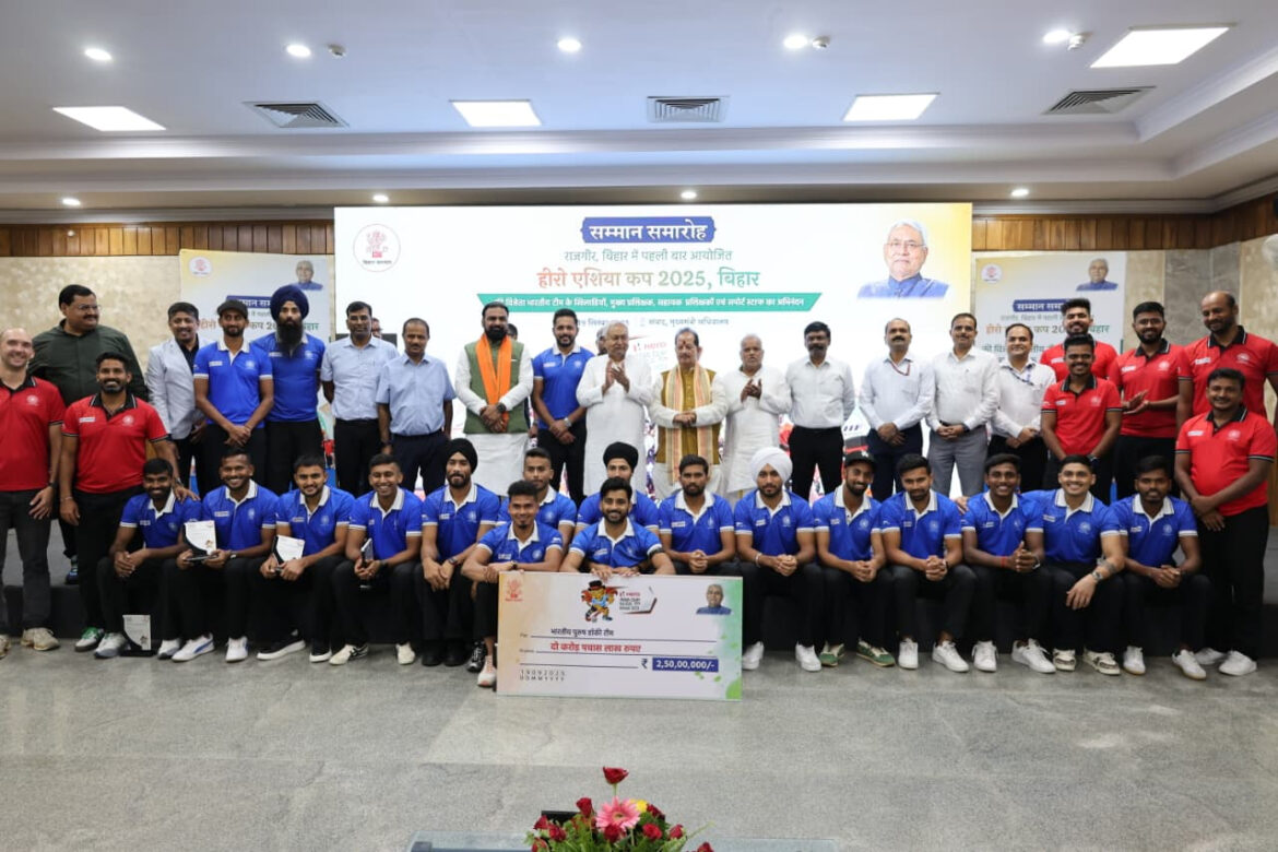 पटना, 19 सितंबर। मुख्यमंत्री नीतीश कुमार ने मुख्यमंत्री सचिवालय स्थित ‘संवाद’ में आयोजित विशेष सम्मान समारोह में हीरो एशिया कप 2025 विजेता भारतीय पुरुष हॉकी टीम के खिलाड़ियों, मुख्य और सहायक प्रशिक्षकों तथा सपोर्ट स्टाफ को सम्मानित किया।