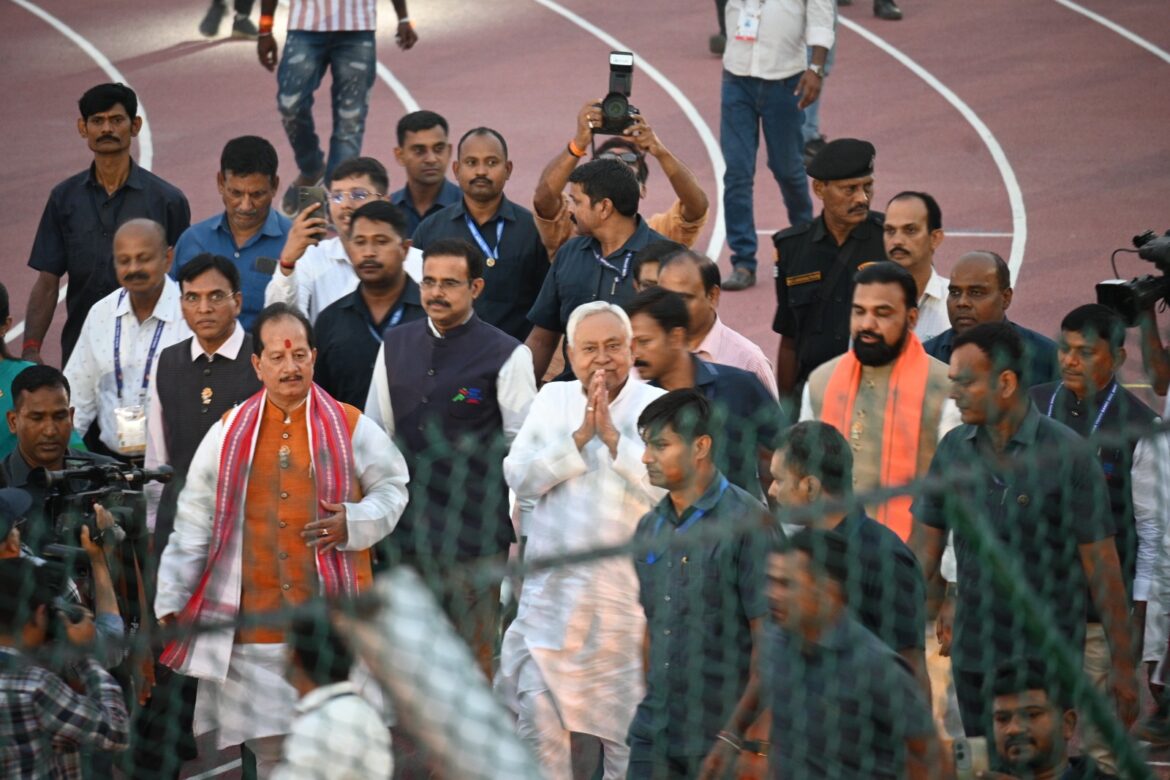 मुख्यमंत्री ने कार्यक्रम की शुरूआत के पूर्व पाटलिपुत्र स्पोर्ट्स मैदान में घूमकर सभी अतिथियों एवं खिलाड़ियों का हाथ हिलाकर अभिवादन स्वीकार किया।