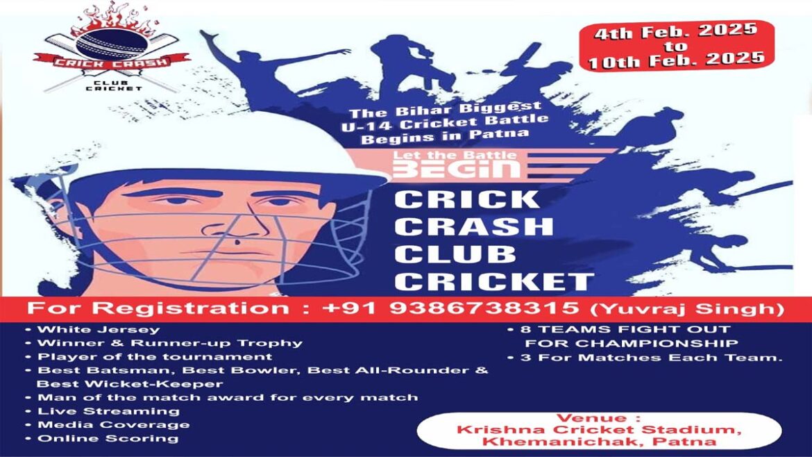 पटना, 5 फरवरी। राजधानी पटना के कृष्णा क्रिकेट स्टेडियम खेमनीचक स्तिथ मैदान पर आगामी 12 फरवरी से क्रिक क्रैश क्लब अंडर-14 क्रिकेट टूर्नामेंट आगाज होने जा रहा है। यह टूर्नामेंट रेड बॉल से व व्हाइट ड्रेस में खेला जायेगा। इसकी जानकारी टूर्नामेंट के अध्यक्ष युवराज सिंह ने दी है।