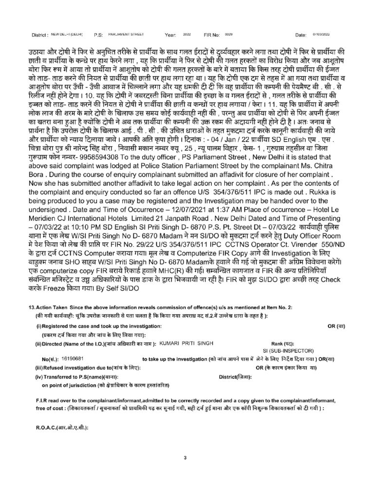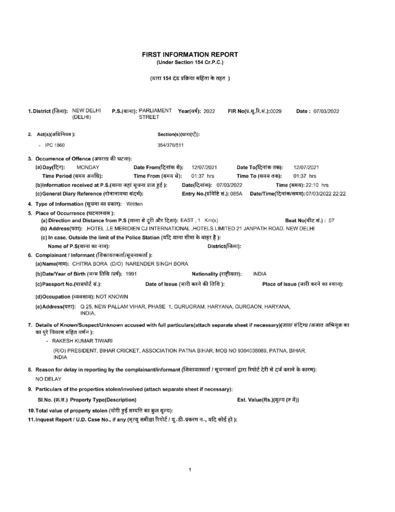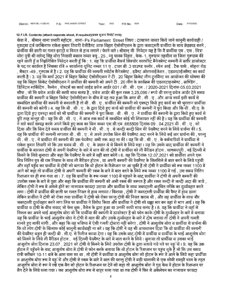 पटना। बिहार क्रिकेट एसोसिएशन के अध्यक्ष राकेश कुमार तिवारी के विरुद्ध नामजद आरोप में महिला से छेड़खानी के मामले में नई दिल्ली के पार्लियामेंट स्ट्रीट थाने ने जांच के बाद एफआईआर दर्ज कर लिया है। राकेश कुमार तिवारी पर यह आरोप/शिकायत चित्रा बोहरा द्वारा थाने में जुलाई, 2021 को दर्ज कराई गई थी। शिकायत की जांच के बाद एफआई आर संख्या 029 सात मार्च,2022 को दर्ज कर लिया गया । एफ आई आर में संबंधित थाना अधिकारी व उनका मो. न. भी दर्ज है।