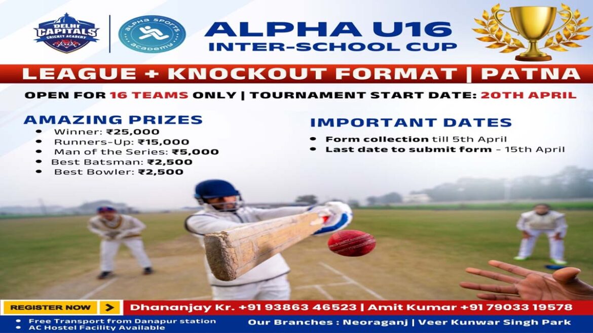 पटना, 20 मार्च। आगामी 20अप्रैल से अल्फा क्रिकेट एकेडमी ग्राउंड पर दिल्ली कैपिटल्स अल्फा इंटर स्कूल कप क्रिकेट टूर्नामेंट का आयोजन किया जायेगा। यह जानकारी एकेडमी के निदेशक सुमित प्रकाश ने दी।