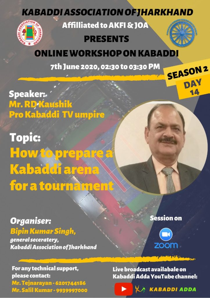 अंत में उन्होंने कबड्डी एसोसिएशन ऑफ झारखंड को काफी प्रशंसा की। उन्होंने कहा की कबड्डी एसोसिएशन ऑफ झारखंड जो ऑनलाइन प्रशिक्षण की व्यवस्था की है वह आधुनिक कबड्डी में आने वाले भविष्य में मील का पत्थर साबित होगा। कबड्डी एसोसिएशन ऑफ झारखंड के सचिव विपिन कुमार सिंह ने बताया कि कल आरडी कौशिक (टीवी एंपायर) रू-ब-रू होंगे।