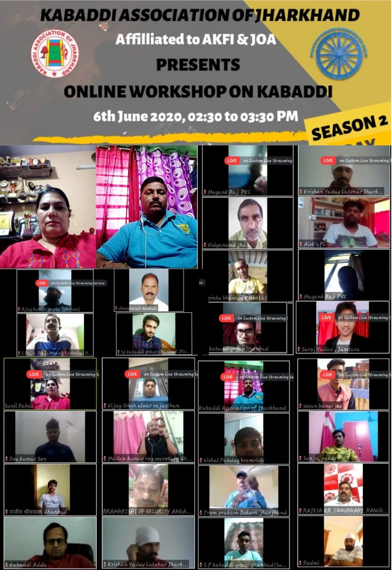 रांची। कबड्डी एसोसिएशन ऑफ झारखंड के द्वारा चलाये जा रहे ऑनलाइन कबड्डी वर्कशॉप में शनिवार को टेक्निकल ऑफिसियल, प्रशिक्षक व खिलाड़ियों से पदम् श्री सह द्रोणाचार्य अवार्डी अंतरराष्ट्रीय महिला कबड्डी कोच डॉ सुनील दबास ऑनलाइन थीं।