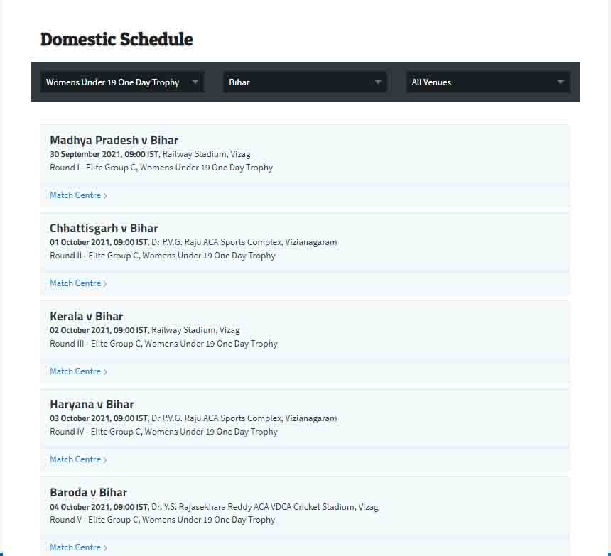बिहार की वीमेंस अंडर-19 क्रिकेट टूर्नामेंट खेलने के लिए विशाखापत्तनम गई हुई है। कल उसका पहला मैच मध्यप्रदेश के खिलाफ होना था जो अब 30 सितंबर को खेला जायेगा। बिहार एक अक्टूबर को छत्तीसगढ़ के खिलाफ, दो अक्टूबर को केरल, 3 अक्टूबर को हरियाणा और चार अक्टूबर को  बड़ोदरा के खिलाफ खेलेगा। पहले 30 सितंबर और 3 अक्टूबर को रेस्ट डे था पर साइक्लोन के कारण मैच बाधित होने के कारण रेस्ट डे को खत्म कर दिया गया।