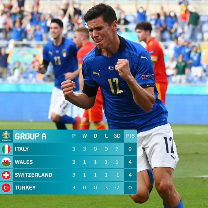 रोम। इटली और वेल्स ने यूरो 2020 के नॉकआउट राउंड में अपनी जगह बना ली है। ग्रुप ए में रविवार को खेले गए मैच में इटली ने लगातार तीसरी जीत दर्ज की। इटली ने वेल्स को 1-0 से हराया। दूसरी ओर वेल्स की टीम अंतिम ग्रुप मैच में हारने के बाद भी क्वालिफाई करने में सफल रही।
