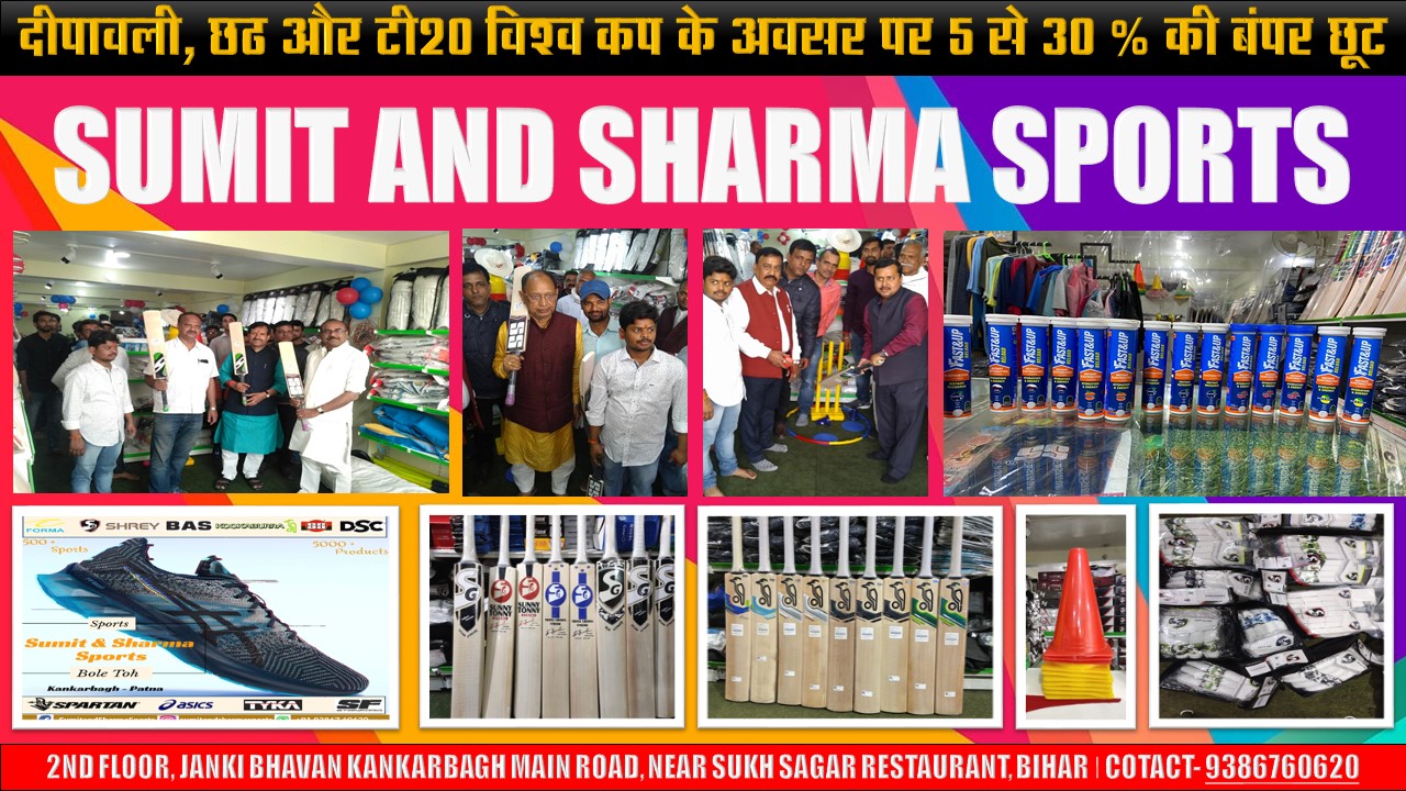 पटना। राजधानी पटना ही पूरे बिहार की नंबर वन Sports Goods खासकर क्रिकेट के सामानों की दुकान सुमित एंड शर्मा Sports में अभी फेस्टिवल ऑफर चल रहा है। दीपावली, छठ और क्रिकेट के महापर्व टी20 विश्व कप को लेकर इस दुकान में खेल सामग्रियों पर 5 से 30 प्रतिशत की छूट मिल रही है।