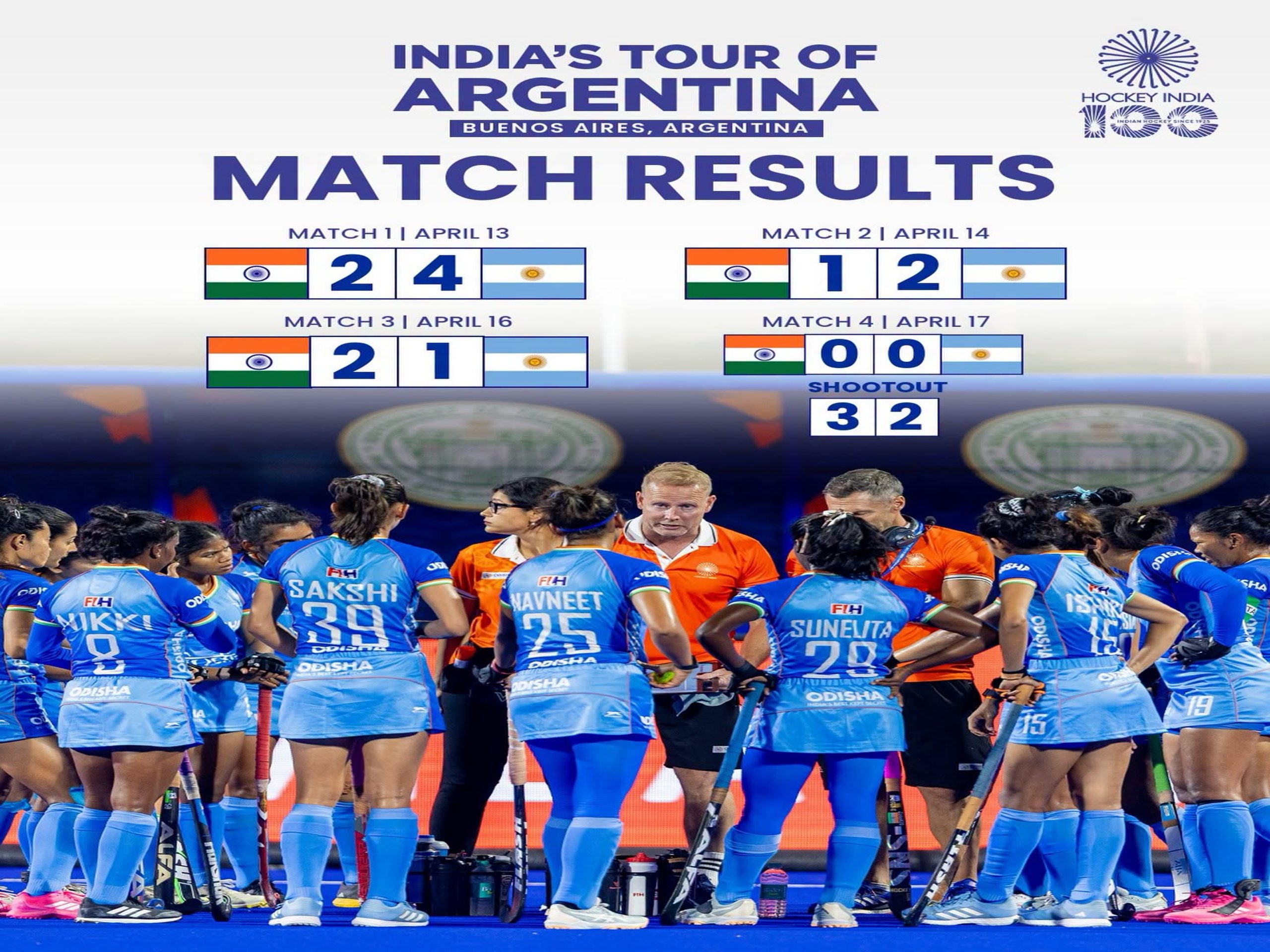 दौरे की शुरूआत 13 अप्रैल को पहले मैच से हुई जिसमें अर्जेंटीना ने 4-2 से जीत दर्ज की। भारत के लिए नवनीत कौर (22वां मिनट) और अन्नु (29वां मिनट) ने गोल दागे जबकि मेजबान टीम के लिए मारिया एमिलिया लारसन (11वां), विक्टोरिया ग्रानाटो (18वां) ने एक एक और जूलिएटा जांकुनास (42वां और 55वां) ने दो गोल किये।