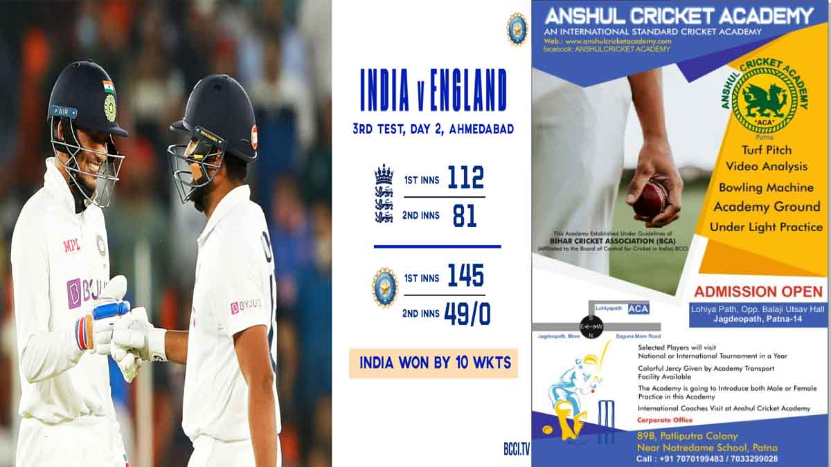 भारत ने अपने स्पिनरों अक्षर पटेल और अश्विन के घातक प्रदर्शन से इंग्लैंड को तीसरे डे नाइट टेस्ट मुकाबले में मात्र दो दिन के अंदर धूल चटा कर नरेंद्र मोदी स्टेडियम में इतिहास रच दिया।
