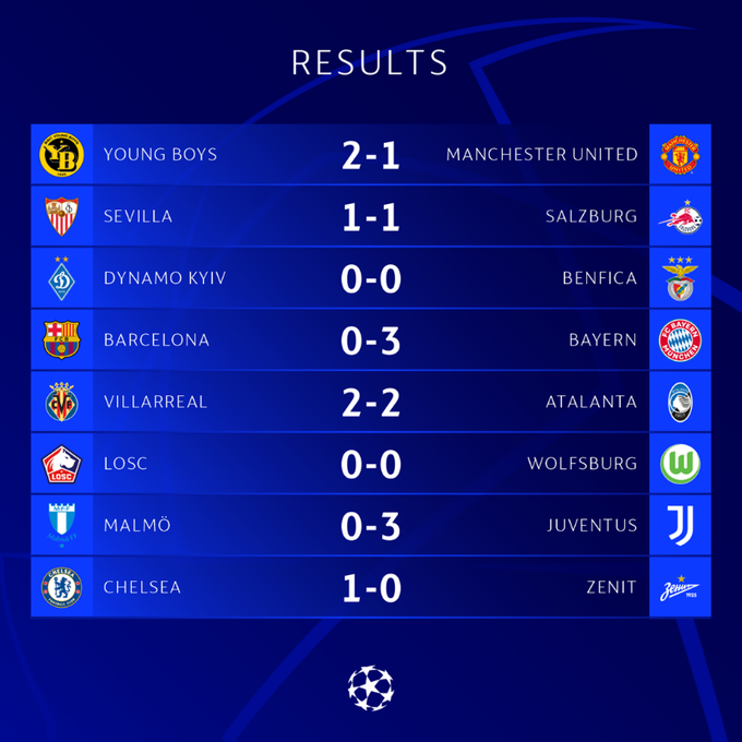 ग्रुप एफ के अन्य मैच में यंग ब्वायज ने मैनचेस्टर यूनाइटेड को 2-1 से हराकर अप्रत्याशित जीत दर्ज की। विलारीयाल का सामना अब मैनचेस्टर यूनाइटेड से जबकि अटलांटा की टक्कर यंग ब्वायज से होगी।
