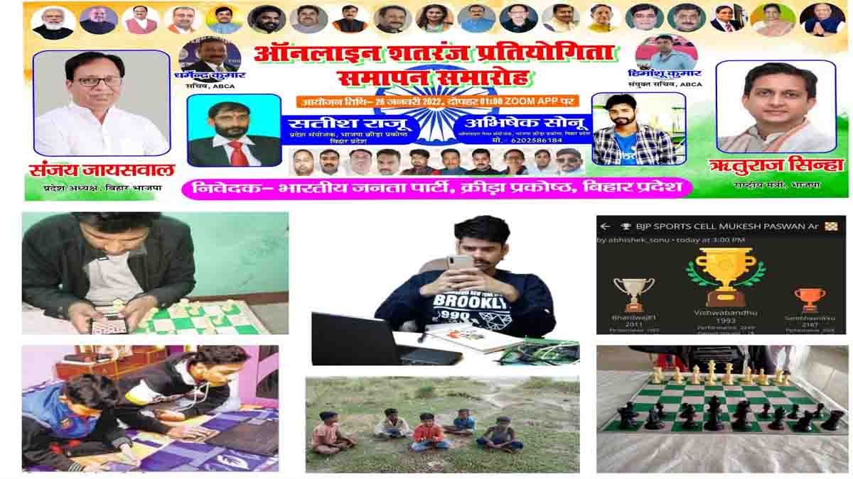 भाजपा क्रीड़ा प्रकोष्ठ के बैनर तले चल रही 15 दिवसीय ऑनलाइन शतरंज प्रतियोगिता के क्षेत्रीय स्तर के अंतिम जोन मुकेश पासवान जोन की प्रतियोगिता के अवसर पर प्रकोष्ठ के प्रदेश संयोजक सतीश राजू ने बताया कि क्षेत्रीय चरण के अंतिम जोन मुकेश पासवान जोन में भागलपुर व खगड़िया जिला का दबदबा रहा। 26 जनवरी को राज्य स्तरीय प्रतियोगिता आयोजित की जायेगी। जिसमें से शीर्ष 10 पुरूष व शीर्ष 5 महिला खिलाड़ी को कोरोना के उपरांत सम्मानित किया जायेगा। उक्त अवसर पर दोपहर 1 बजे से जूम लिंक के माध्यम से वर्चुअली समापन समारोह का आयोजन किया जायेगा। जिसमें कि मुख्य अतिथि के रूप में बिहार भाजपा के प्रदेश अध्यक्ष व पश्चिम चंपारण सांसद डॉ संजय जायसवाल जी, भाजपा के राष्ट्रीय मंत्री श्री ऋतुराज सिन्हा जी तथा विशिष्ट अतिथि के रूप में ऑल बिहार शतरंज संघ के सचिव श्री धर्मेंद्र कुमार जी व संयुक्त सचिव श्री हिमांशु कुमार जी सम्मिलित होंगे।