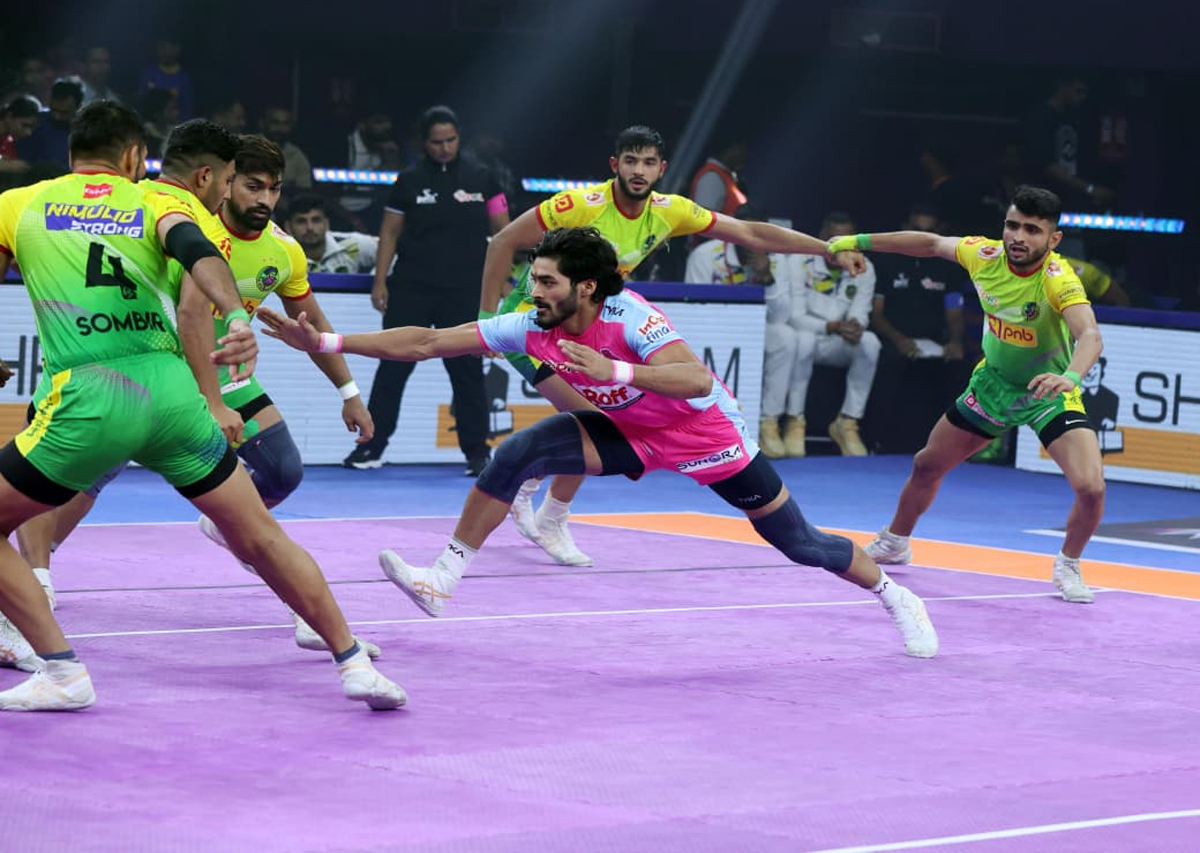 जयपुर की जीत में नितिन धनखड़ (13 अंक) ने अहम भूमिका निभाई और इसमें अली समाधी (8) ने बेहतरीन साथ दिया। पटना ने दूसरे हाफ में वापसी की भरपूर कोशिश की ओर मनिंदर सिंह (15 अंक) की बदौलत बड़े अंतर को पाटते हुए दो अंक के फासले तक पहुंचे लेकिन स्टार रेडर अयान (6) का नहीं चल पाना उसे खला। सुधाकर (9) ने हालांकि मनिंदर का अच्छा साथ दिया।