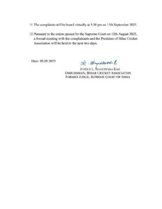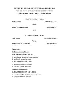 पटना, 9 सितंबर। सुप्रीम कोर्ट द्वारा नियुक्त बिहार क्रिकेट संघ के लोकपाल न्यायमूर्ति एल. नागेश्वर राव (पूर्व न्यायाधीश, सर्वोच्च न्यायालय) के यहां बिहार क्रिकेट संघ के चुनाव को लेकर की गई शिकायत पर मंगलवार को सुनवाई शुरू हुई। बिहार क्रिकेट संघ द्वारा घोषित चुनाव को लेकर आदित्य वर्मा और अमित कुमार ने लोकपाल के पास अपनी शिकायत दर्ज की थी। शिकायतकर्ताओं की ओर से वरिष्ठ अधिवक्ता अभिनव श्रीवास्तव और प्रतिवादी बिहार क्रिकेट एसोसिएशन की ओर से आत्माराम एन.एस. नाडकर्णी की दलीलें सुनी गईं।