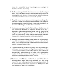 अमित कुमार की ओर से यह निवेदन किया गया था कि वर्ष 2022 में मतदाता सूची तैयार करने के लिए जिन घटनाओं को आधार बनाया गया उनके आधार पर पात्र सदस्यों के नाम मतदाता सूची से हटाए जाने और अपात्र सदस्यों के नाम मतदाता सूची में शामिल किए जाने की संभावना है। मसौदा मतदाता सूची पर आपत्तियों का निपटारा करने के बाद निर्वाचन अधिकारी द्वारा मतदाता सूची को अंतिम रूप देने का कार्य 18 सितंबर 2025 को पूरा होने वाला है। इसके जवाब में प्रतिवादी बिहार क्रिकेट एसोसिएशन के विद्वान वरिष्ठ वकील ने कहा कि बिहार क्रिकेट संघ की सूची में शामिल सभी सदस्यों को मसौदा मतदाता सूची में शामिल किया जाएगा जिसे निर्वाचन अधिकारी को भेजा जाएगा।