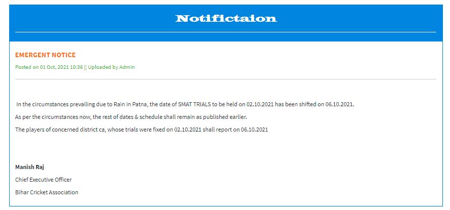 पटना। बीसीसीआई के तत्वाधान में आगामी आयोजित होने वाली सैयद मुश्ताक अली टी-20 ट्रॉफी में बिहार का प्रतिनिधित्व करने वाली सीनियर पुरुष वर्ग टीम का चयन होने वाले सेलेक्शन ट्रायल की तिथि में थोड़ा परिवर्तन किया  गया है। बिहार क्रिकेट एसोसिएशन के ऑफिसियल वेबसाइट पर डाली गई सूचना के अनुसार दो अक्टूबर को होने वाला सेलेक्शन ट्रायल अब छह अक्टूबर को आयोजित किया जायेगा।