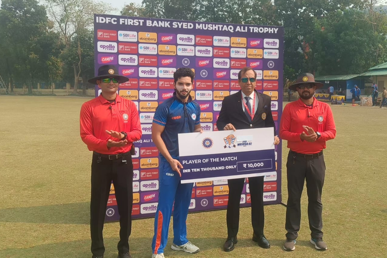 SMAT 2025 मैच में मैन ऑफ द मैच का पुरस्कार करते हुए पीयूष कुमार सिंह, बिहार vs उत्तर प्रदेश मैच।