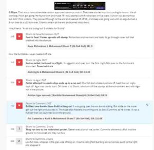 आखिरी ओवर मोहम्मद शमी कर रहे थे। पहली गेंद पर पैट कमिंस ने दो रन लिये। दूसरी गेंद पर कमिंस ने दो रन ले लिये। तीसरी गेंद पर शमी ने कमिंस को विराट कोहली के हाथों कैच करवाया। चौथी गेंद पर शमी ने ऑस्टन अगर को रन आउट किया। पांचवीं गेंद पर जोस इंग्लिश को और छठी गेंद पर केन रिचड्सन का विकेट चटकाया।