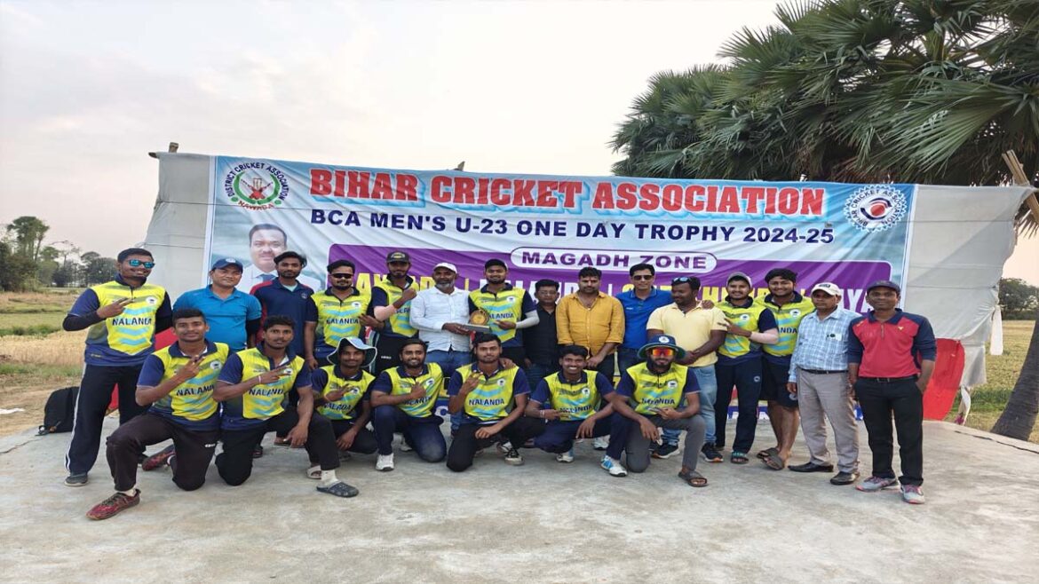 जवाब में नालंदा ने 49 ओवर में 8 विकेट पर 362 रन बनाया। नमन गौरव ने 131 गेंद में 20 चौका छह छक्का लगाकर नाबाद 166 रन की आकर्षक पारी खेली। अर्णव किशोर ने 37 गेंद में 7 चौका 7 छक्का की मदद से 76 रन और आदित्य कुमार ने 44 गेंद में छह चौका व एक छक्का की मदद से 47 रन बनाया।