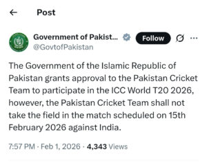 पाकिस्तान ने टी20 विश्व कप 2026 में भारत के खिलाफ होने वाले अपने ग्रुप मैच के बहिष्कार का फैसला वापस ले लिया है। यह मुकाबला 15 फरवरी को कोलंबो में खेला जाएगा। पाकिस्तान सरकार ने सोमवार देर रात सोशल मीडिया प्लेटफॉर्म X पर बयान जारी कर कहा कि “अब तक हासिल परिणामों और मित्र देशों के अनुरोधों को ध्यान में रखते हुए” टीम को भारत के खिलाफ मैदान में उतरने की अनुमति दी गई है।