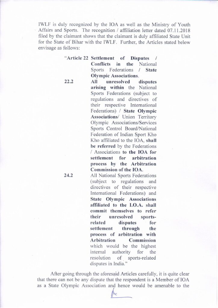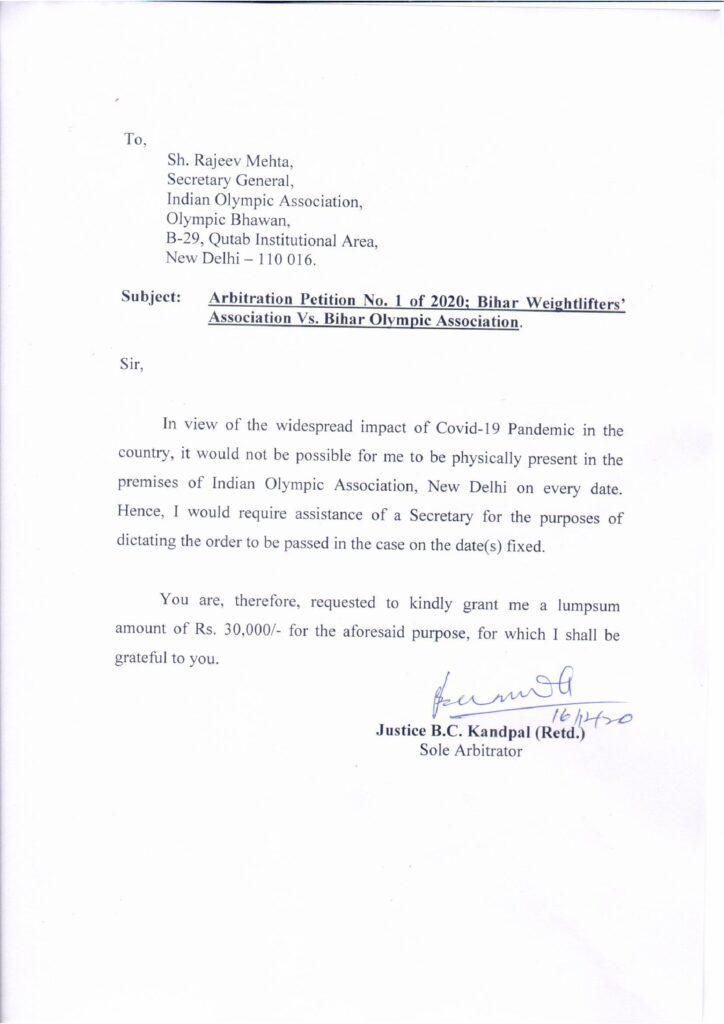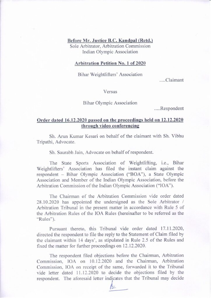 Arbitrator के फैसले पर रोक लगाने के लिए बिहार ओलिम्पिक संघ ने माननीय दिल्ली उच्च न्यायलय के समक्ष W.P.(C) 11084/2020 दायर किया था जिसपर आज सुनवाई के बाद बिहार ओलिंपिक संघ को किसी प्रकार की राहत नहीं मिली। दिल्ली उच्च नयायालय ने सुनवाई की अगली तारीख 11 फ़रवरी 2021 निर्धारित की है। अब बिहार ओलिंपिक संघ को 12 दिसम्बर के Arbitrator के आदेश का पालन करते हुये 2 जनवरी को अपना जवाब दाखिल कर सुनवाई में सम्मिलित होना पड़ेगा।