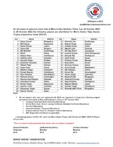 पटना। पिछले दिनों 23 से 26 अक्टूबर तक बिहार क्रिकेट एसोसिएशन द्वारा आयोजित विजय हजारे ट्रॉफी सेलेक्शन ट्रायल के बाद शार्टलिस्टेड प्लेयरों की सूची प्रिपेट्री कैंप के लिए जारी कर दी गई है। कैंप 28 अक्टूबर से आयोजित किया गया है। कैंप पटना के मोइनुल हक स्टेडियम में लगाया गया है।