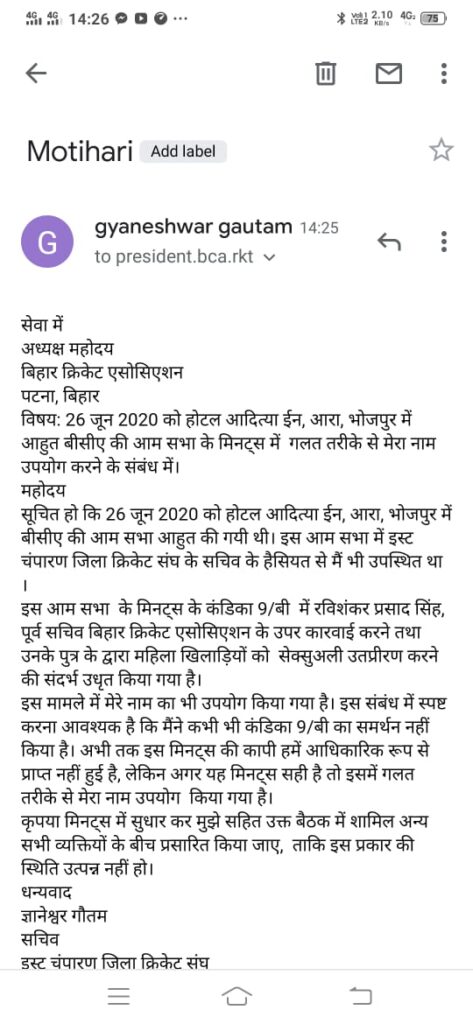 पटना। सोशल मीडिया पर वायरल हो रहे इस पत्र से बिहार क्रिकेट जगत का पारा एकाएक गर्म हो गया है। यह वायरल ईमेल पत्र पूर्वी चंपारण जिला क्रिकेट संघ के सचिव ज्ञानेश्वर गौतम ने बिहार क्रिकेट संघ.Com साइड वाले अध्यक्ष को लिखा है। इस ईमेल में ज्ञानेश्वर गौतम ने 26 जून 2020 को आरा में आयोजित हुए बिहार क्रिकेट संघ (राकेश तिवारी के नेतृत्व वाली) एजीएम के मिनट्स पर सवाल खड़ा किया है। ज्ञानेश्वर गौतम ने कहा है कि जिस चीज को मैंने उठाया ही नहीं उसमें मेरे नाम का जिक्र क्यों किया गया।